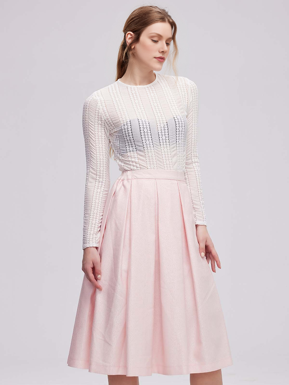 | Die Romantikerin | Zarte Farben, Spitze, Blumenmuster | Rosa Spitzen-Dirndl mit taillierter Schnürung |
